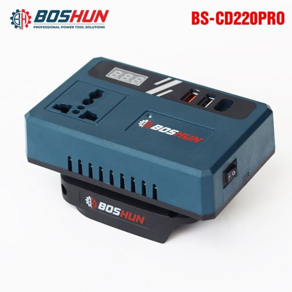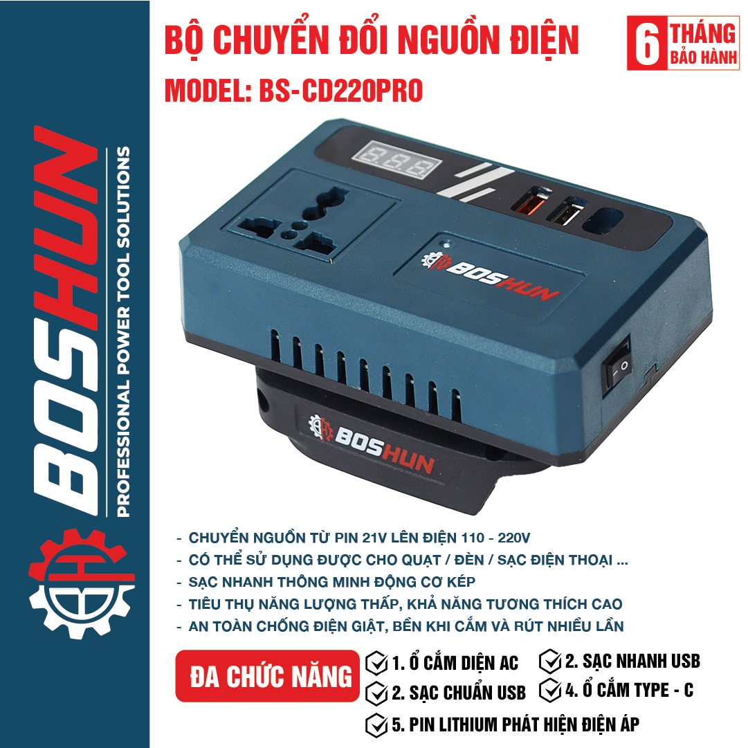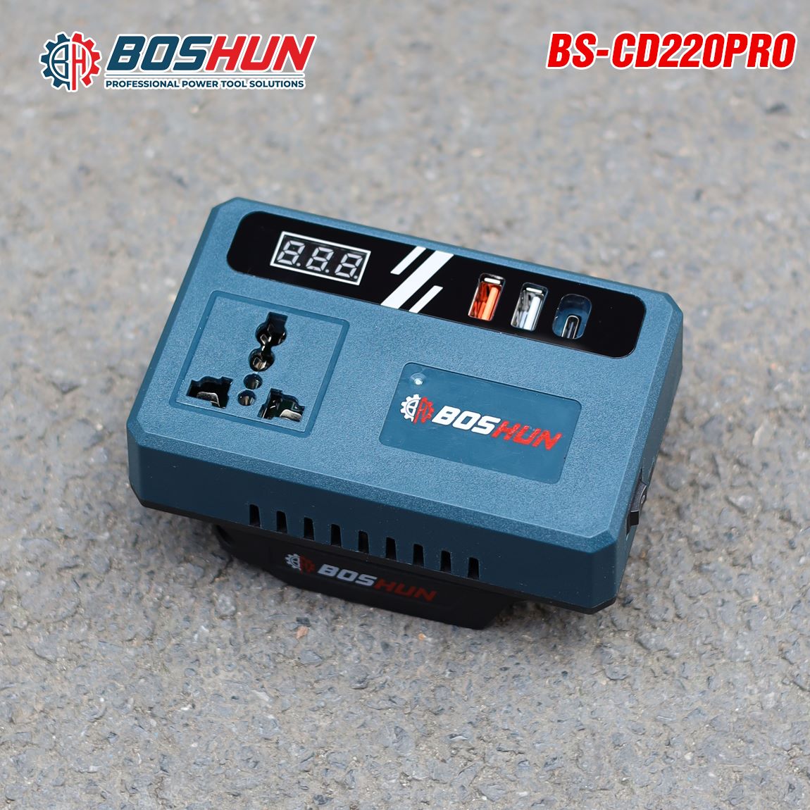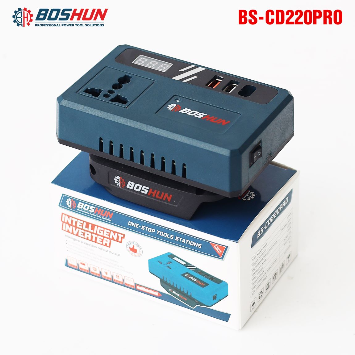 Bộ chuyển đổi nguồn điện BS-CD220PRO, Chuyển nguồn từ pin 21V lên điện 110 – 220V, Dùng cho Quạt/Đèn/Sạc điện thoại