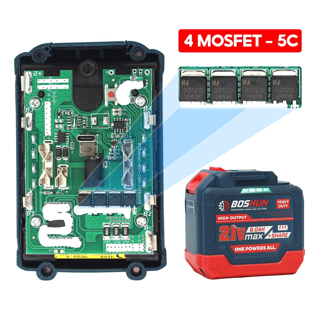 - Bảng mạch lớn full màn, 4 mosfet chịu tải, với dòng xả 5C đáp ứng các thiết bị công suất lớn ăn dòng hoạt động không bị ngắt