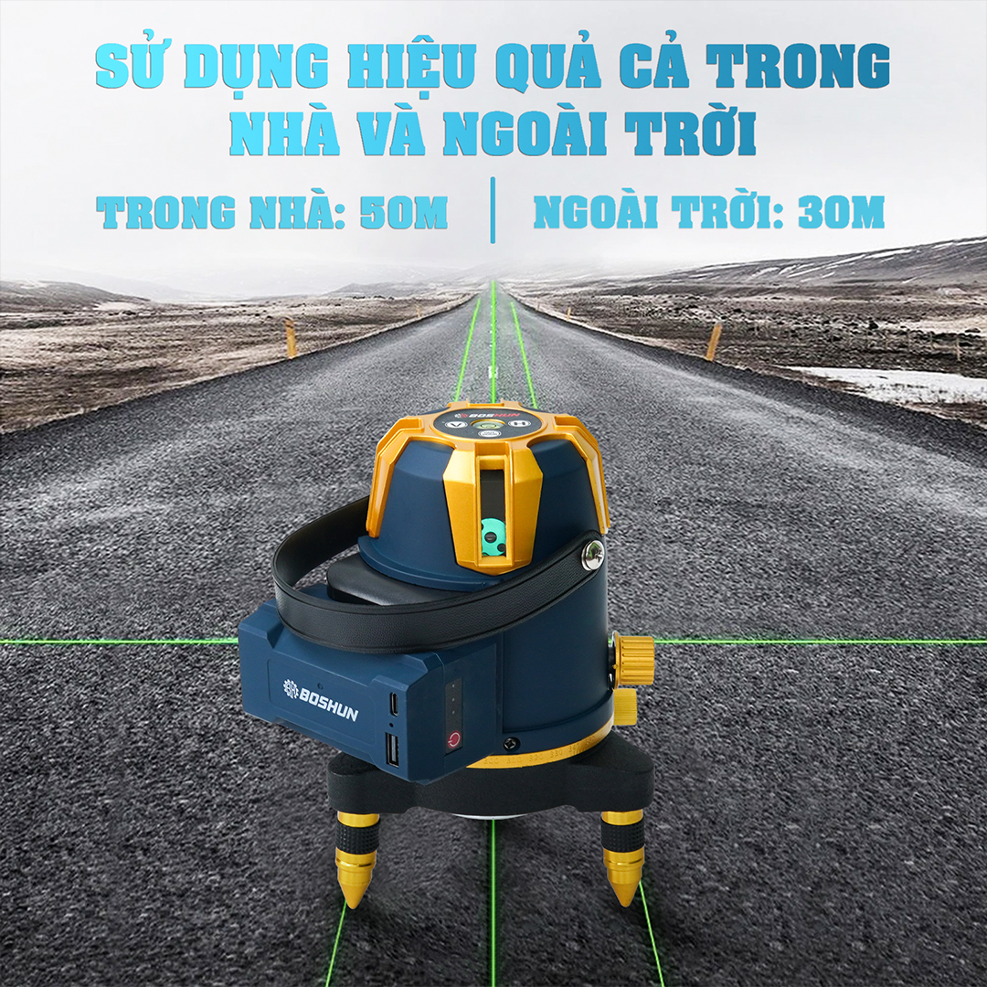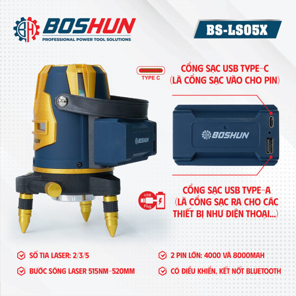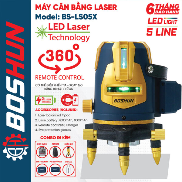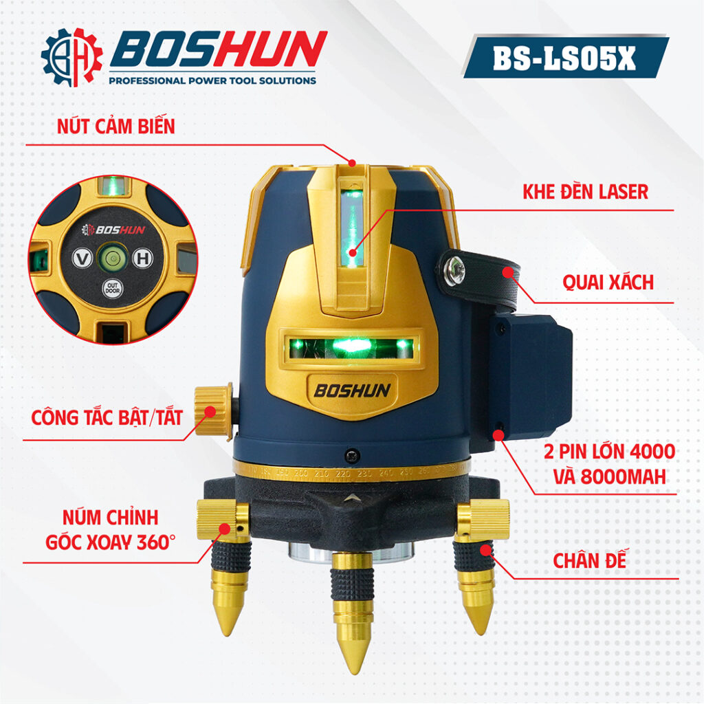 Máy cân bằng Laser Boshun BS-LS05X – 5 tia xanh – Xoay 360 độ – Điều khiển Bluetooth