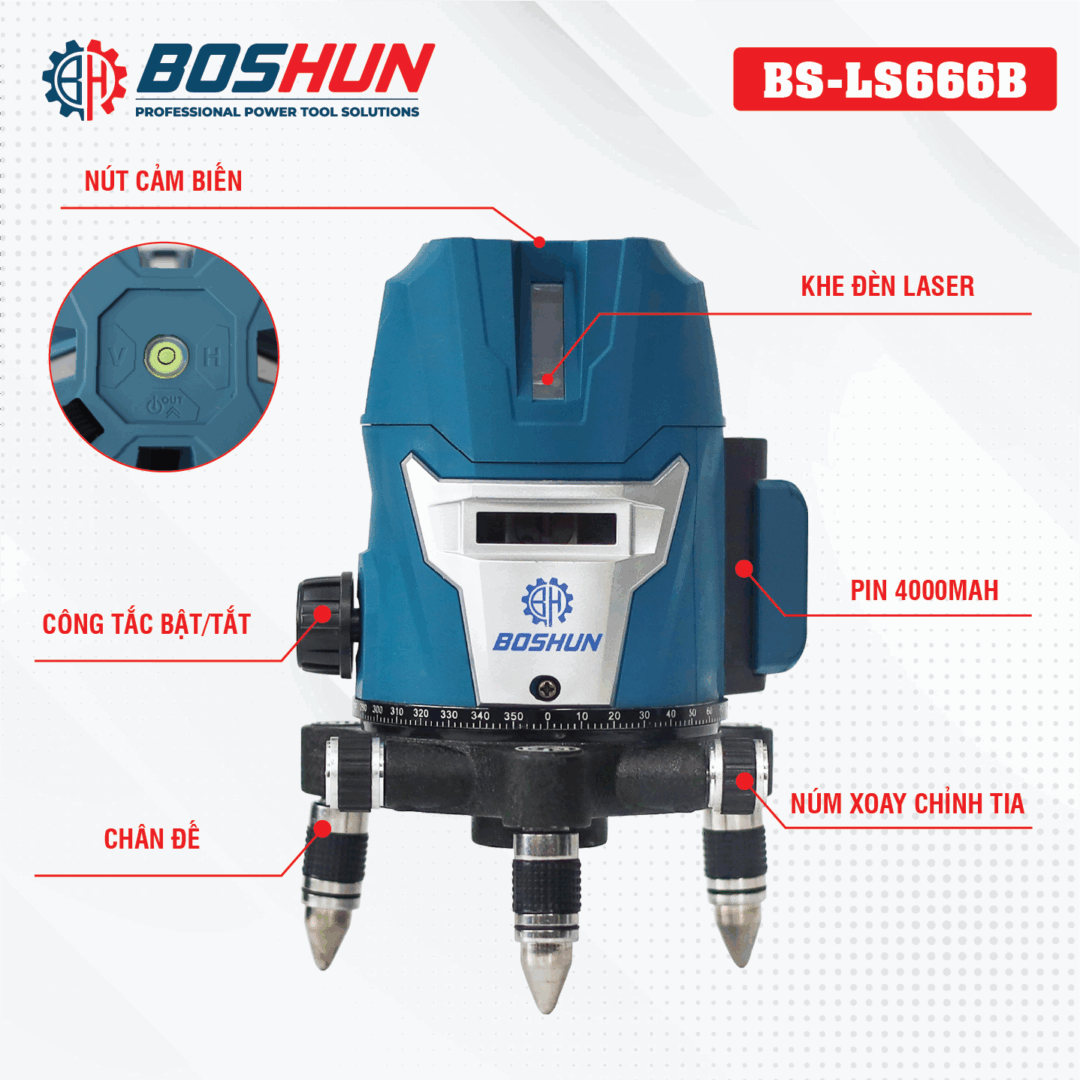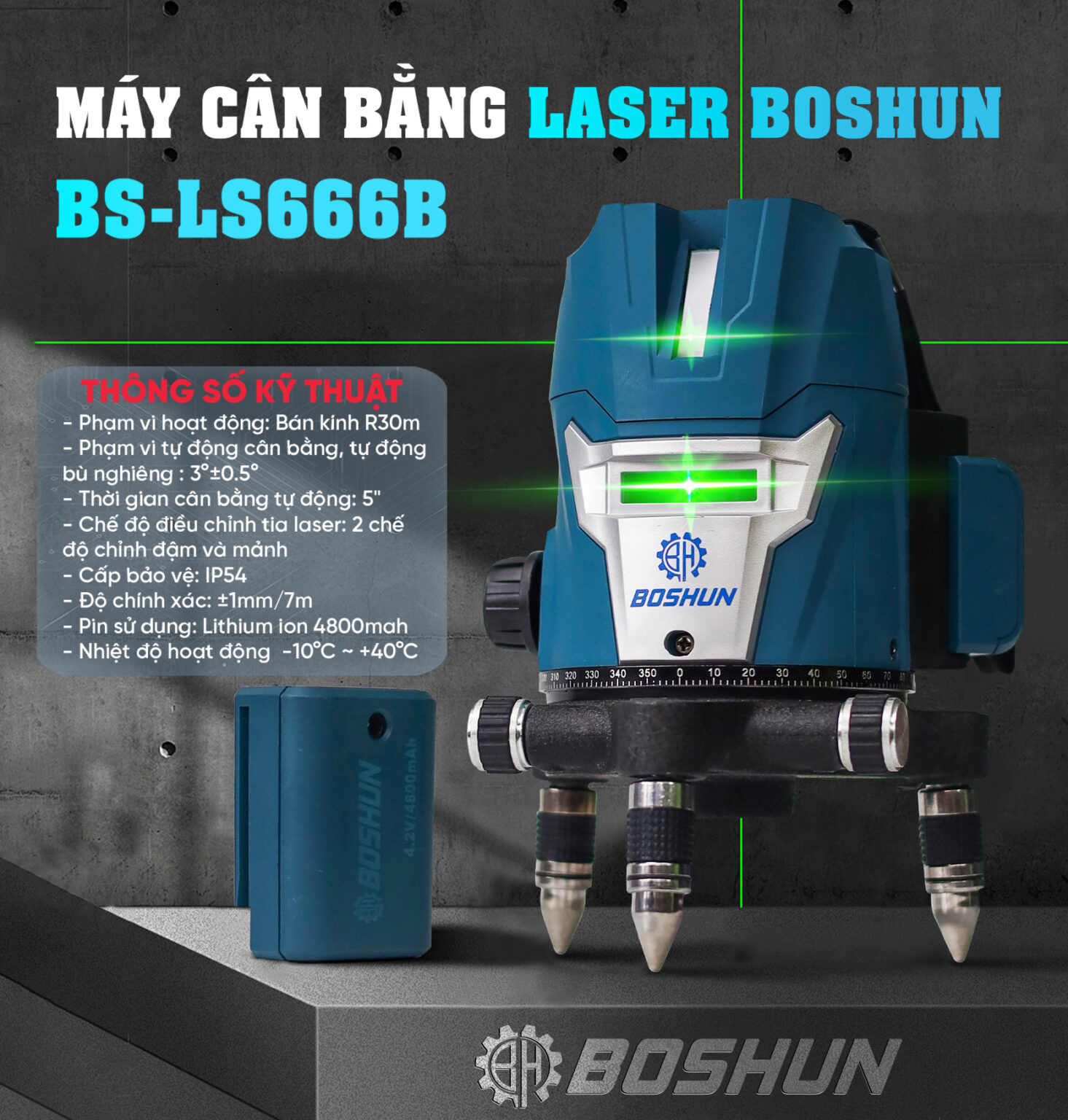 Máy cân bằng laser Boshun BS-LS666B được trang bị 2 viên pin Li-ion dung lượng lớn 4800mAh