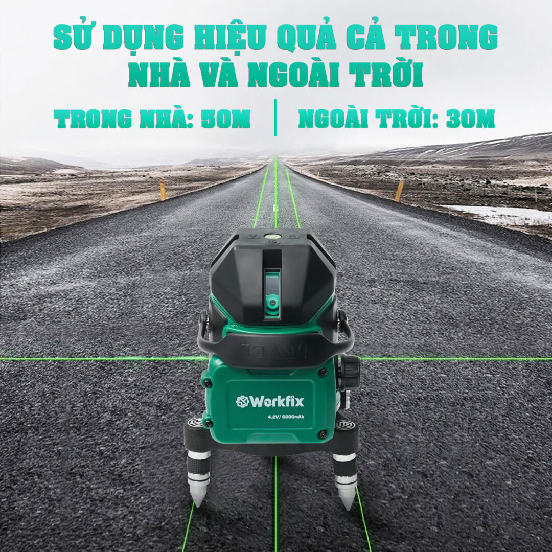 4 tia đứng cho phép định vị chính xác các góc, 1 tia ngang tạo đường chuẩn hoàn hảo, 1 tia dọi tâm hỗ trợ xác định điểm chuẩn. Tầm nhìn rõ ràng trong mọi điều kiện ánh sáng