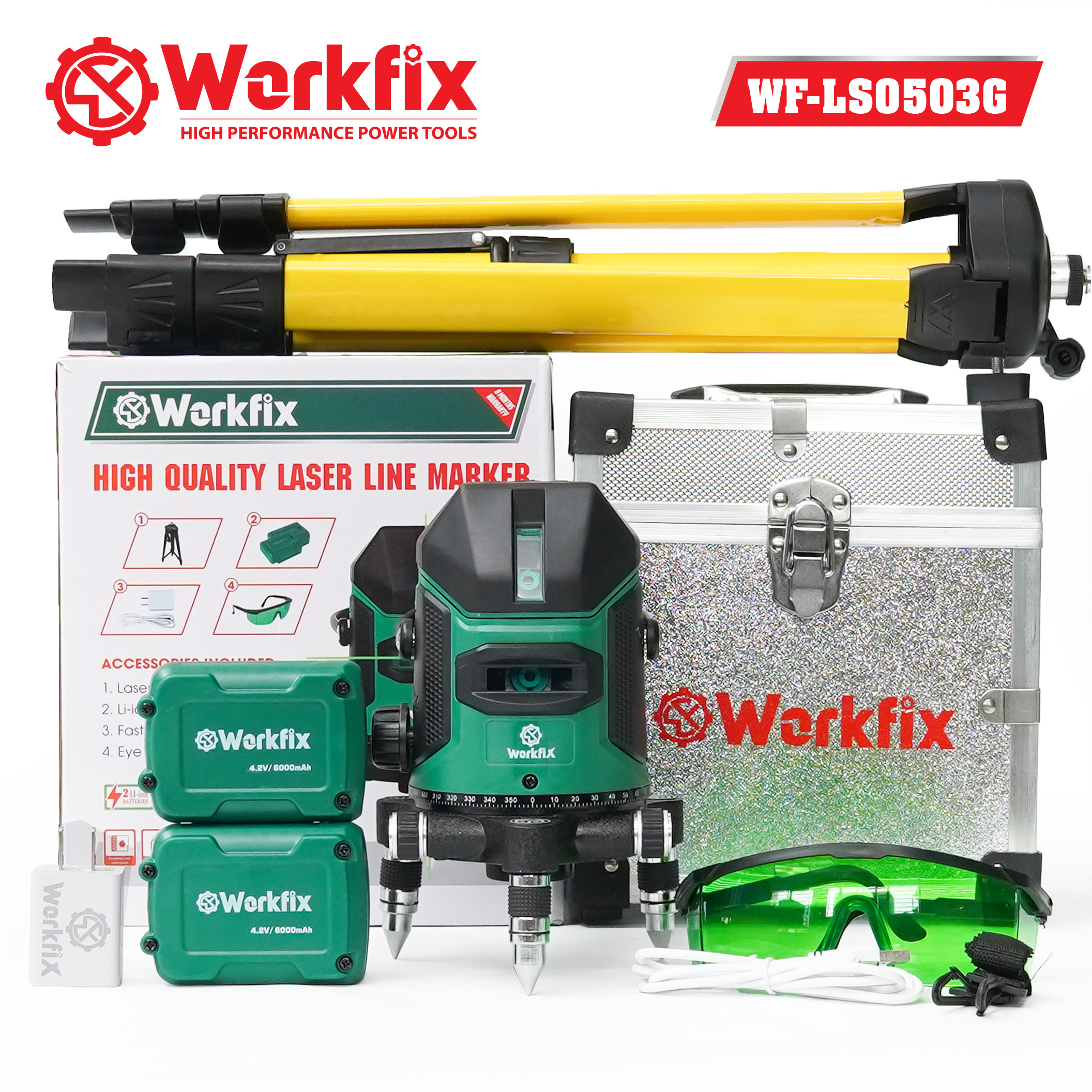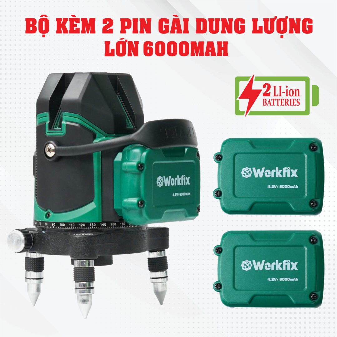 Máy cân bằng laser Workfix WF-LS0503G được trang bị 2 viên pin Li-ion dung lượng cao gồm: 2 pin 6000mAh