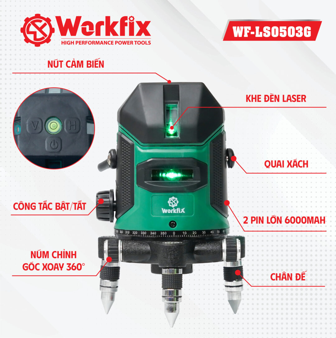 Máy cân bằng laser Workfix được trang bị cơ chế xoay 360 độ, dễ dàng điều chỉnh hướng tia theo mọi góc độ cần thiết mà không phải di chuyển toàn bộ thiết bị.