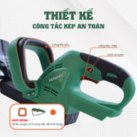 - Với thiết kế an toàn, máy được trang bị với công tắc kép là NHẤN và GIỮ cả 3 công tắc để khởi động máy