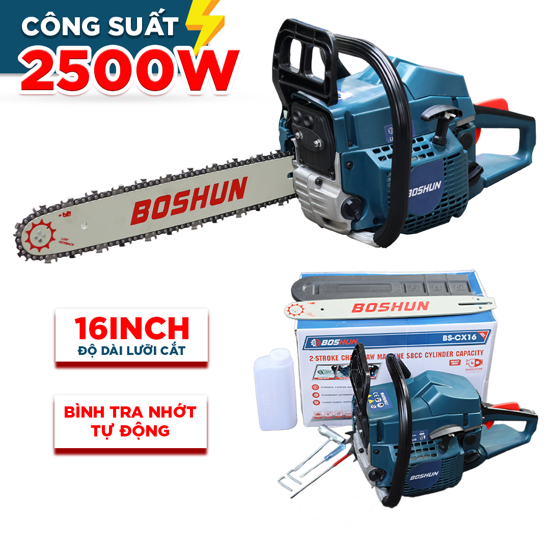 Máy cưa xăng 58CC BOSHUN BS-CX16, Lam xích dài 16INCH, Bơm nhớt tự động – Động cơ xăng 2 thì mạnh mẽ