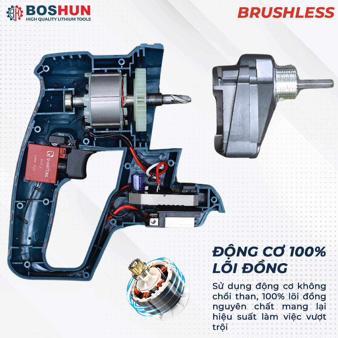 Máy Đầm Dùi Bê Tông Pin Boshun BS-DG35BL sử dụng động cơ 100% lõi đồng không chổi than cao cấp giúp cho máy có thể hoạt động bền bỉ, tiêu hao ít năng lượng hơn