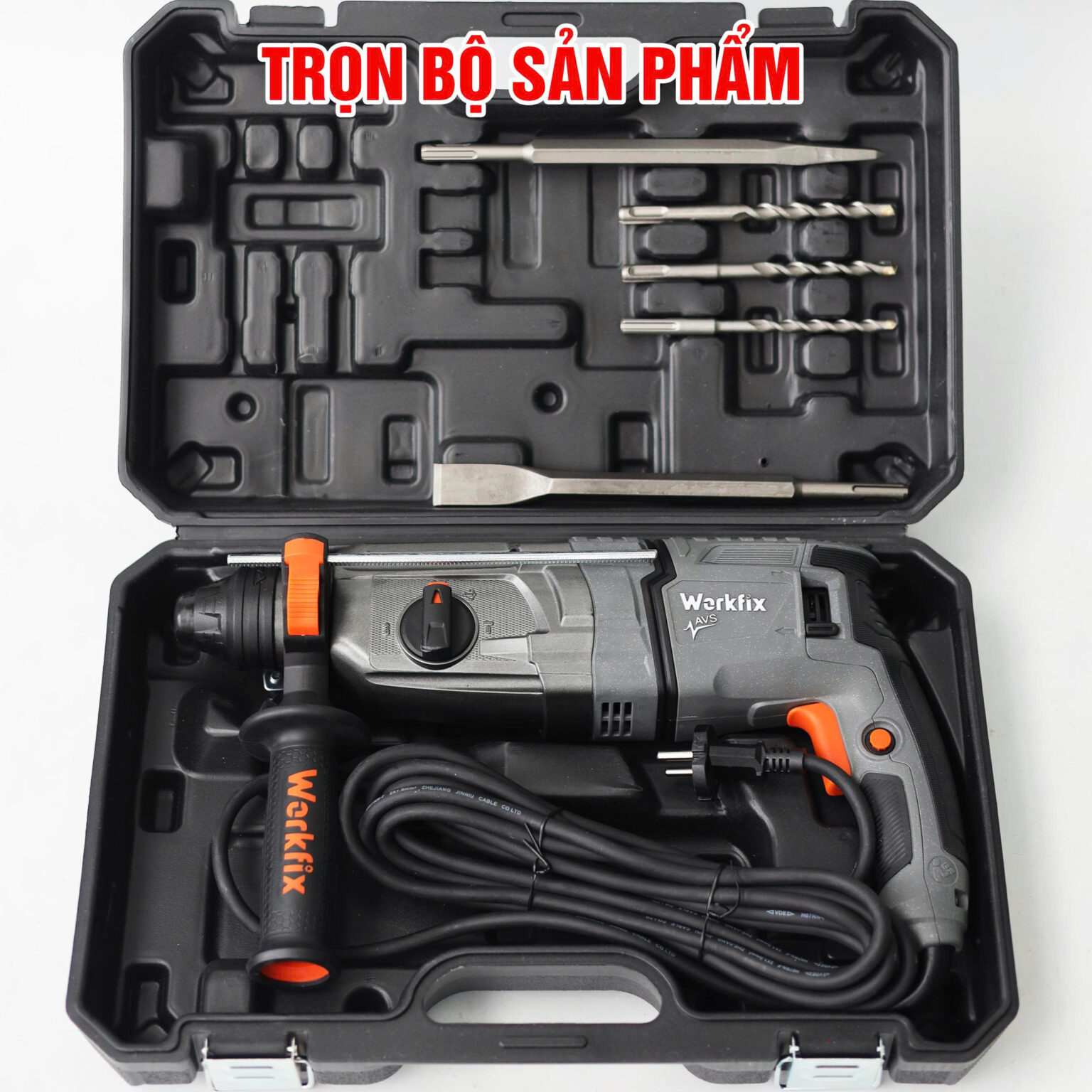 Bộ sản phẩm máy khoan bê tông điện Workfix WF-RH1200AVS: Thân máy lực đập 3.6J, 5 mũi khoan tặng kèm, tay cầm trợ lực, hộp nhựa.