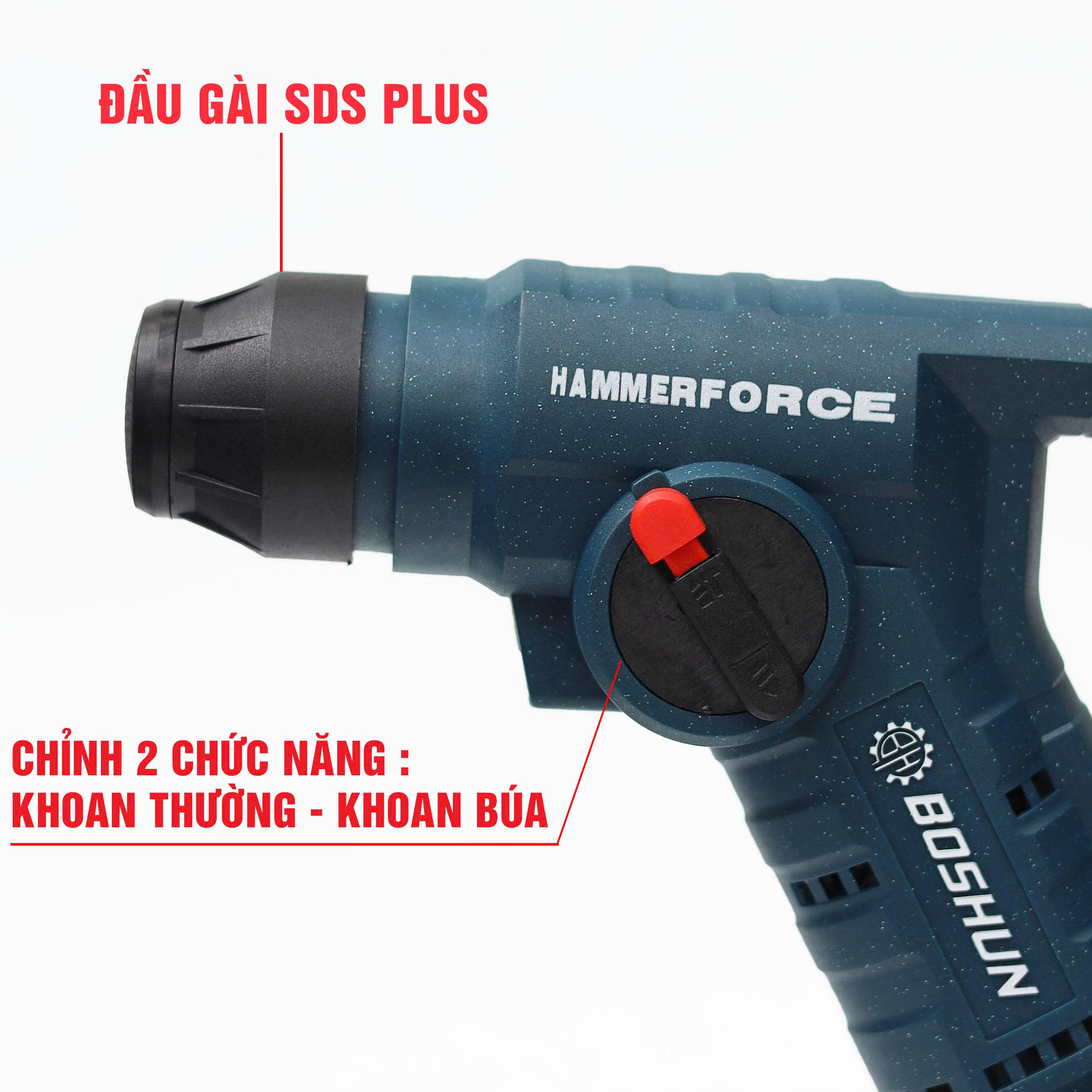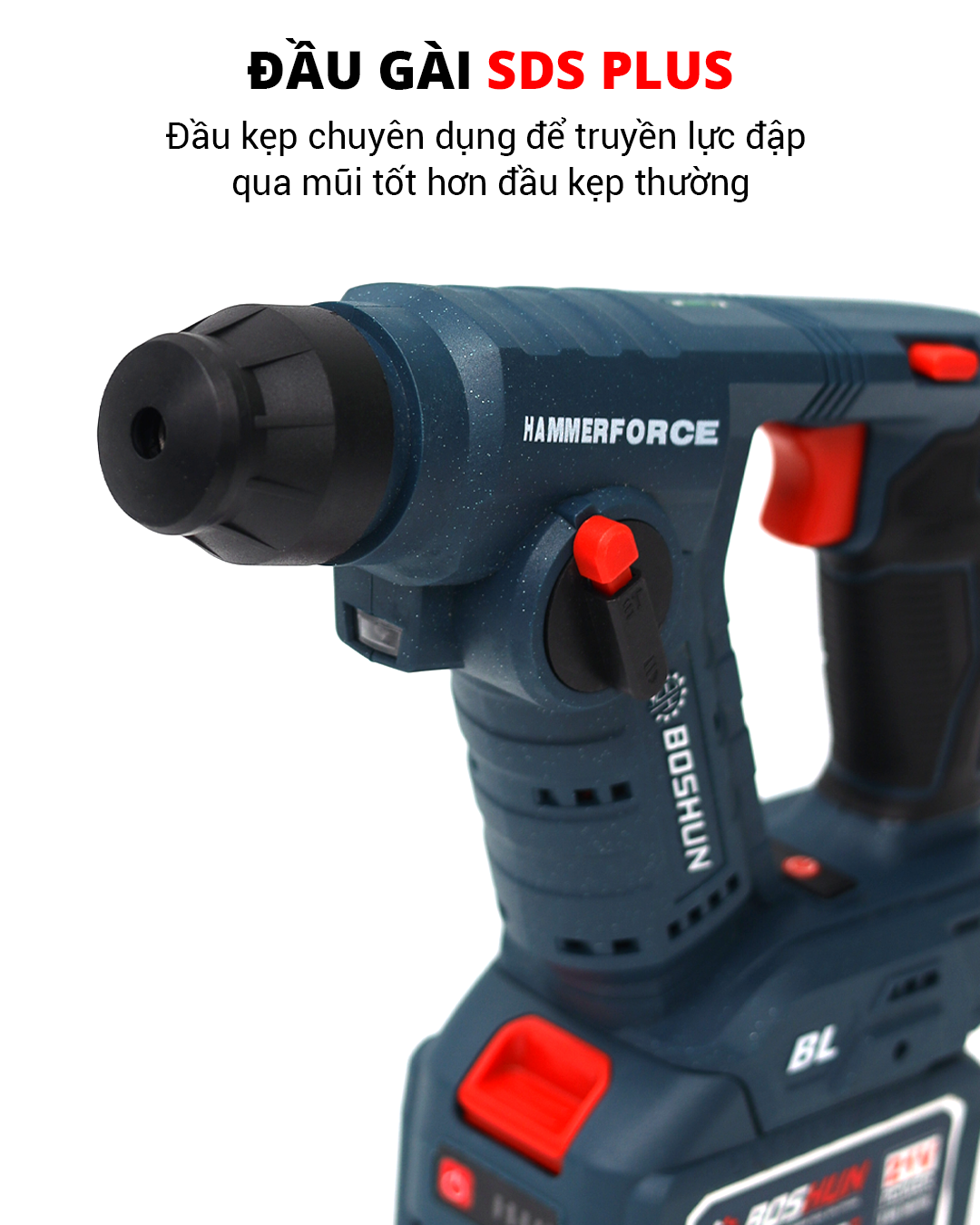 - Đầu cặp SDS Plus thao tác nhanh: Giúp tháo lắp mũi khoan chỉ trong 1 giây, giữ chắc chắn và tương thích mọi mũi khoan thông dụng.