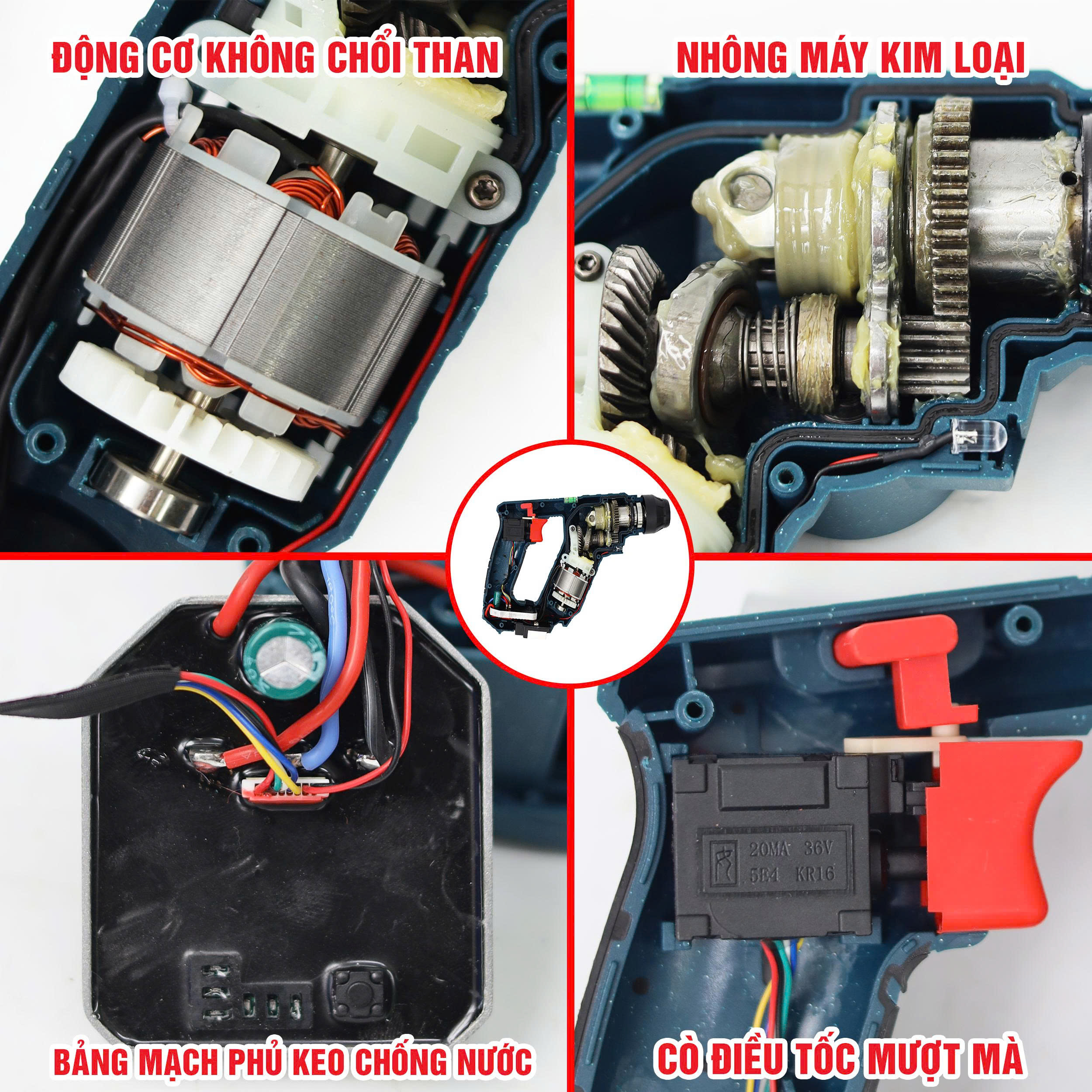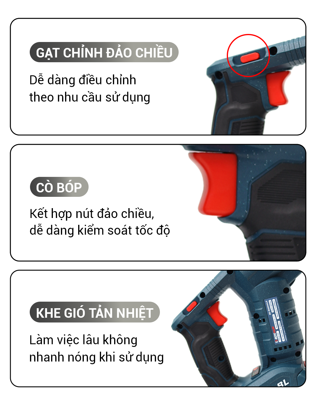 - Động cơ không chổi than hiện đại: Mạnh mẽ, êm ái, tiết kiệm pin tới 30%, không sinh nhiệt quá mức và không tốn phí bảo dưỡng thay chổi than.