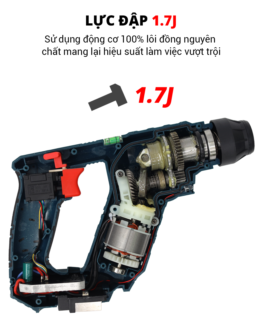 - 🔨 Xuyên phá vật liệu cứng: Khoan tường, gạch, bê tông mỏng dễ dàng và nhanh chóng với lực đập 1.7J.