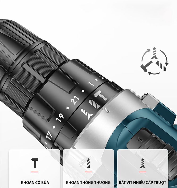 – 3 chế độ: Khoan, Búa, Bắt vít / 25 cấp trượt dễ dàng bắt các loại ốc vít