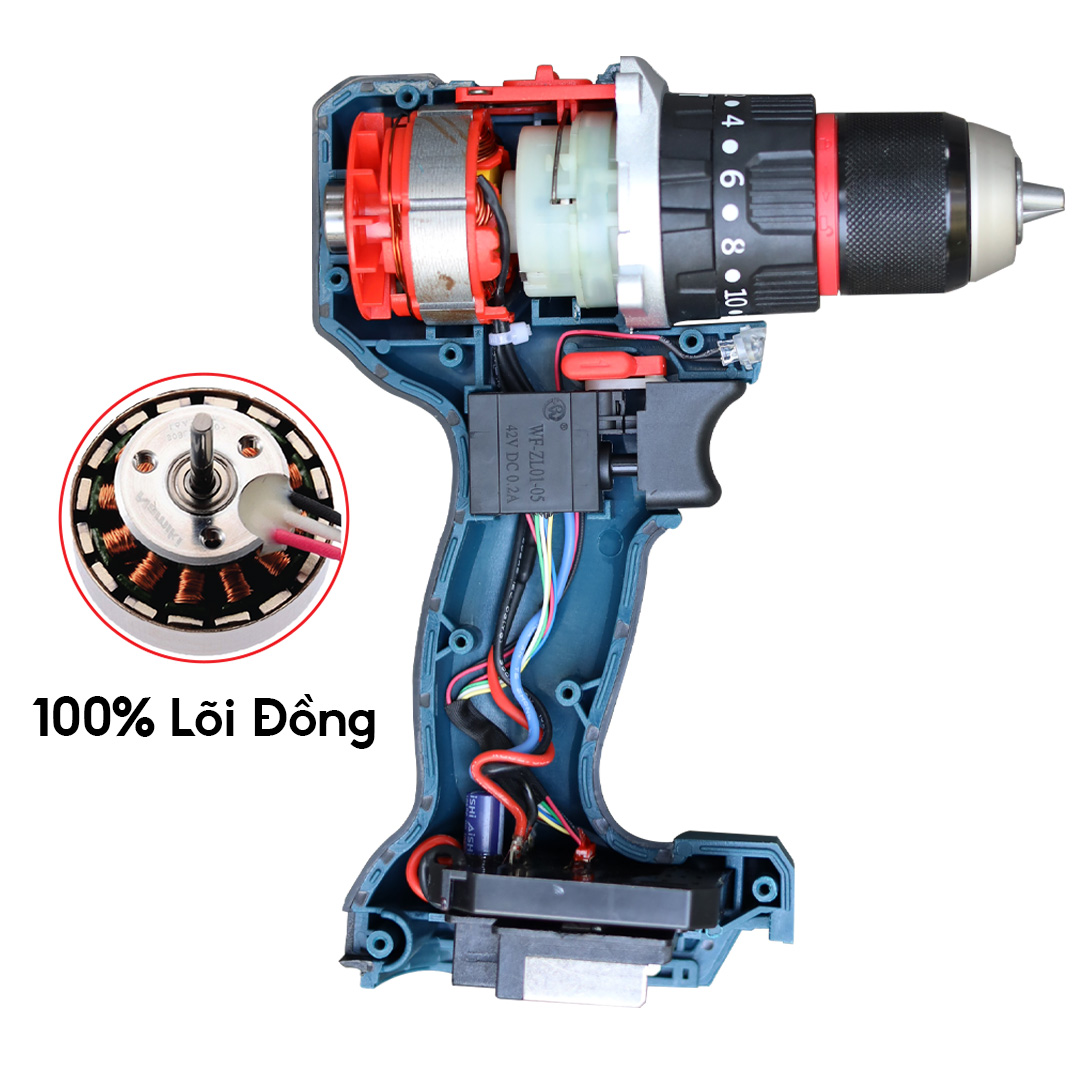 Động cơ 100% lõi đồng không chổi than cao cấp, nhông kim loại giúp cho máy có thể hoạt động bền bỉ, tiêu hao ít năng lượng hơn.