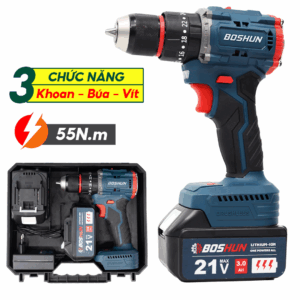 Ngoài điều tốc ở cò bóp, boshun BS-ID2110BL trang bị 2 cấp lực: nhanh – chậm. Máy trang bị 3 chức năng: khoan tường, bắt vít, khoan thường
