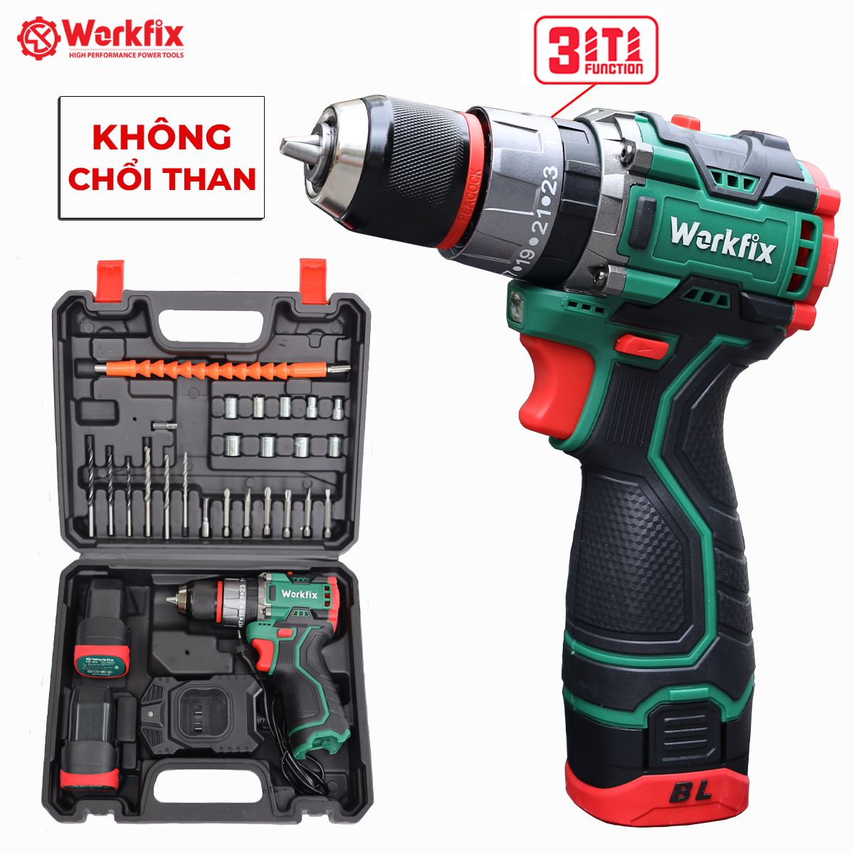 - 3 CHỨC NĂNG: Khoan thường; Khoan búa; Bắn vít