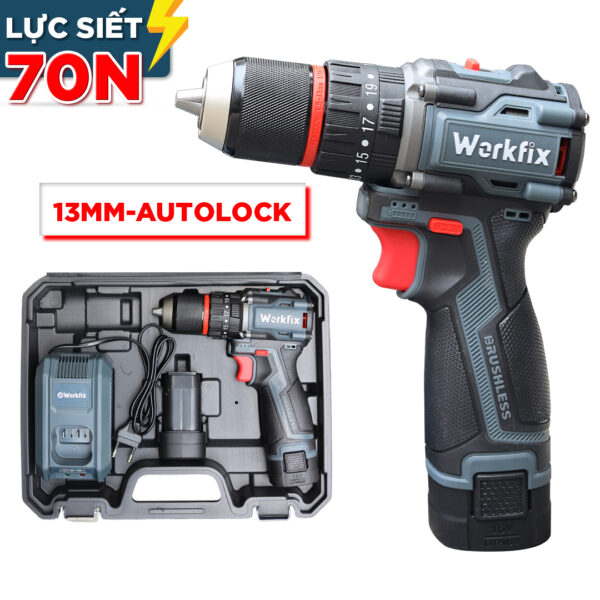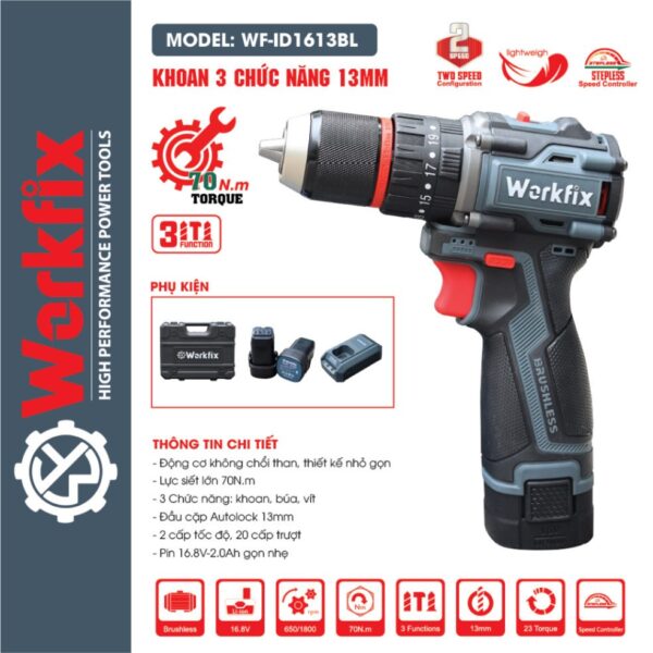 Máy khoan pin Workfix WF-ID1613BL Không Chổi Than – Đa năng Bắt vít – Khoan – Búa – Bảo Hành 12 tháng