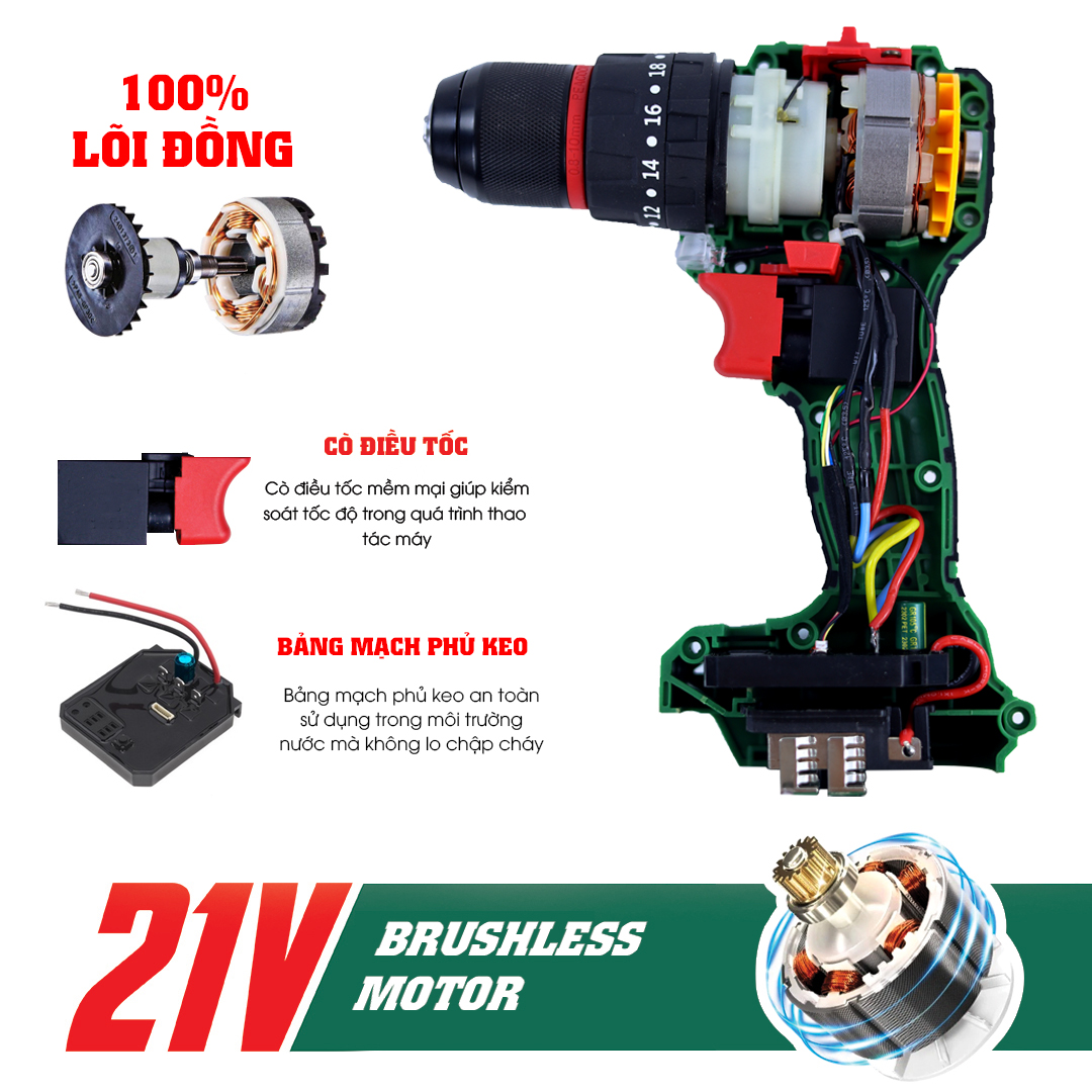 - Động cơ KHÔNG CHỔI THAN mạnh mẽ + Lõi Đồng 100%