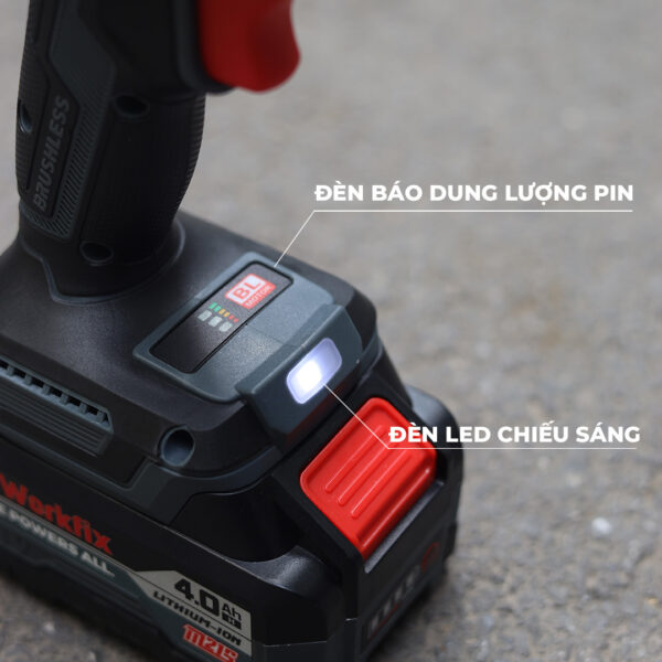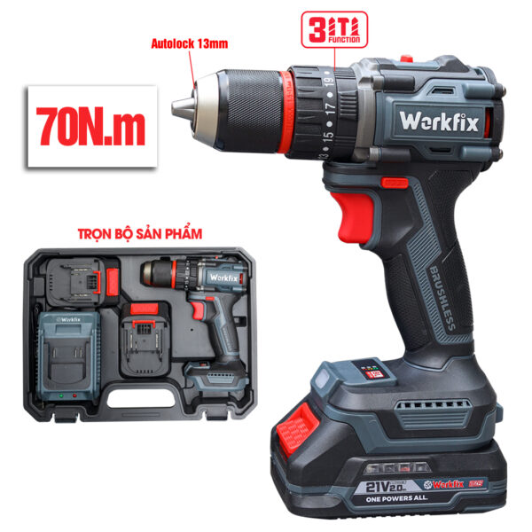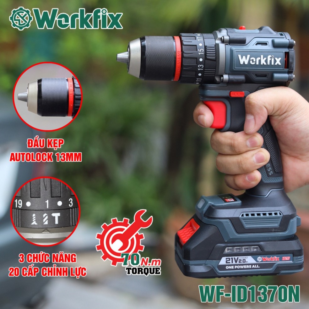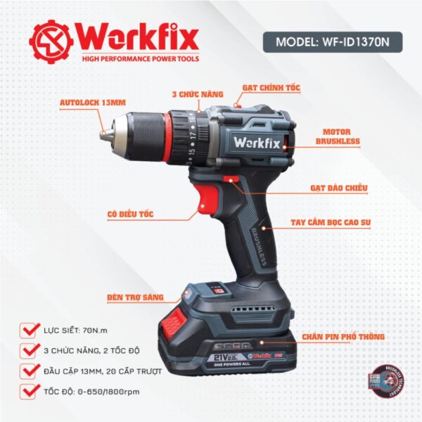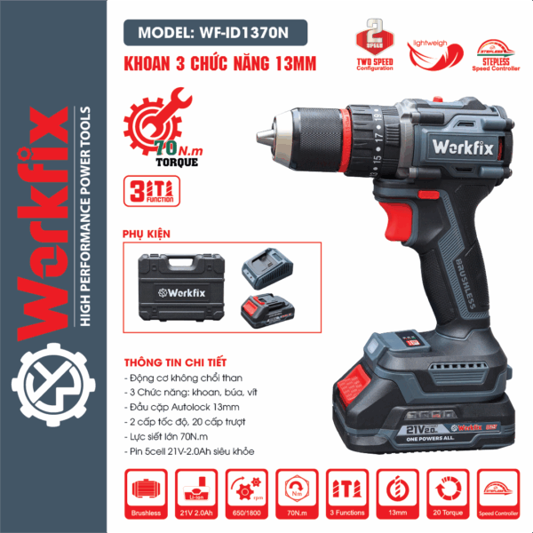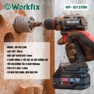 - Tên sản phẩm: Máy khoan pin WORKFIX WF-ID1370N, Động cơ Không chổi than, Lực siết 70Nm, 3 Chức năng, 13mm Autolock