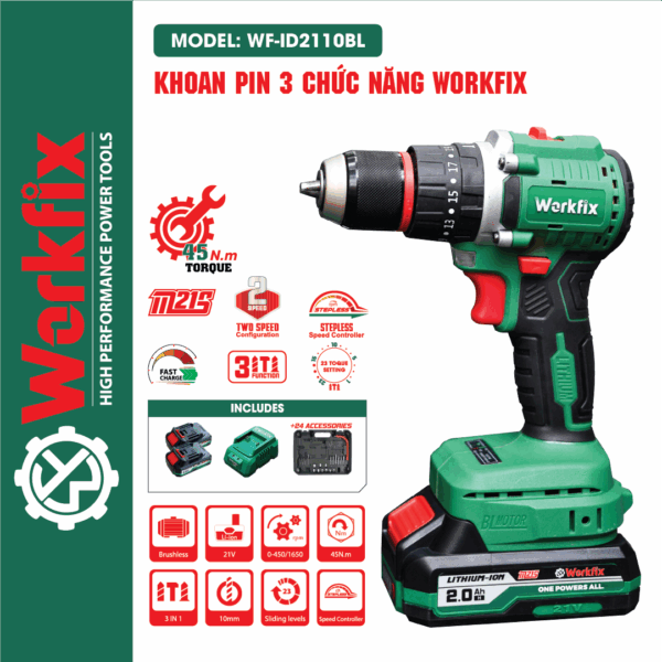 Máy Khoan Pin Workfix WF-ID2110BL – Tặng bộ phụ kiện 24 món