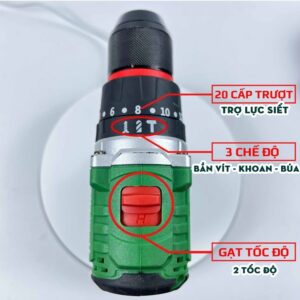 Thiết lập 20 mô-men xoắn cho phép điều chỉnh phù hợp đối với từng kích thước vít giúp khoan vặn vít hiệu quả, đảo chiều và 2 tốc độ nhanh chậm.