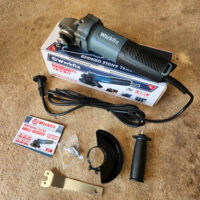 Trọn bộ sản phẩm gồm: thân máy mài, tay cầm, thanh chắn, khóa mở và tặng bộ chổi than.