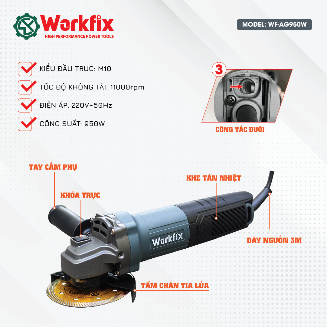 – Máy mài, máy cắt dùng điện WORKFIX WF-AG950W chuyên dùng để mài góc, cắt sắt, cưa gỗ, cắt gạch, cắt đá hoa cương trong gia đình hoặc công trình xây dựng