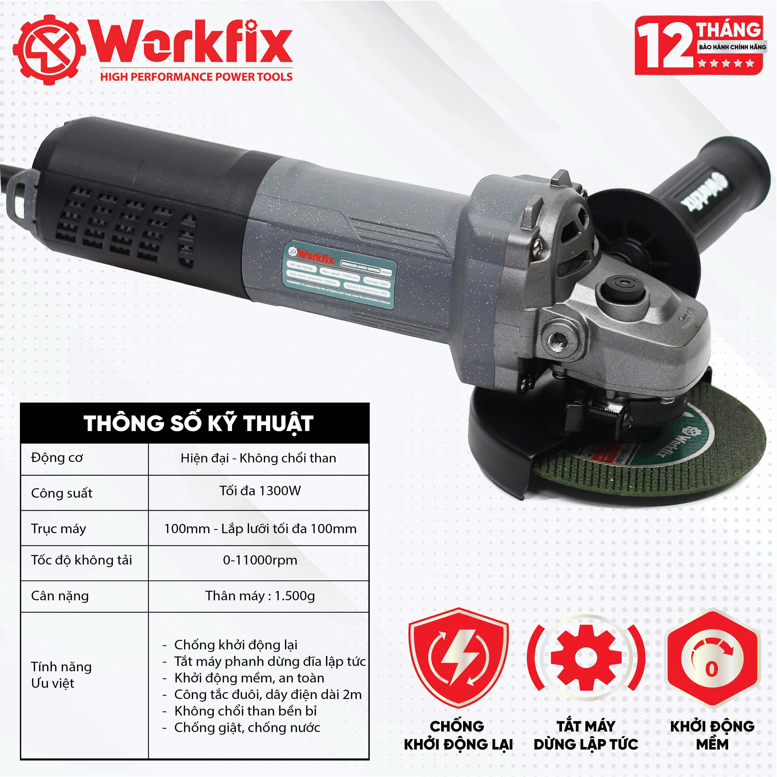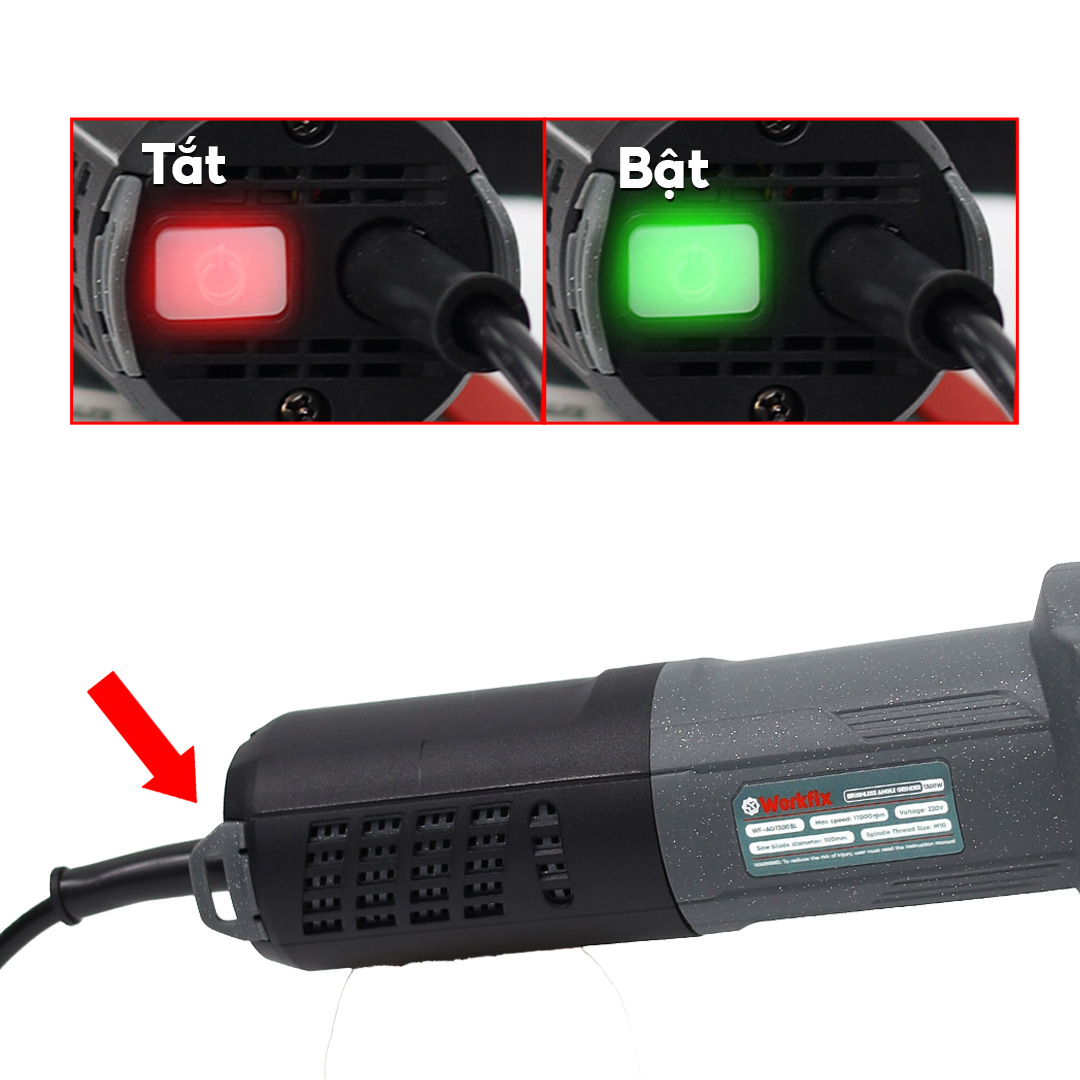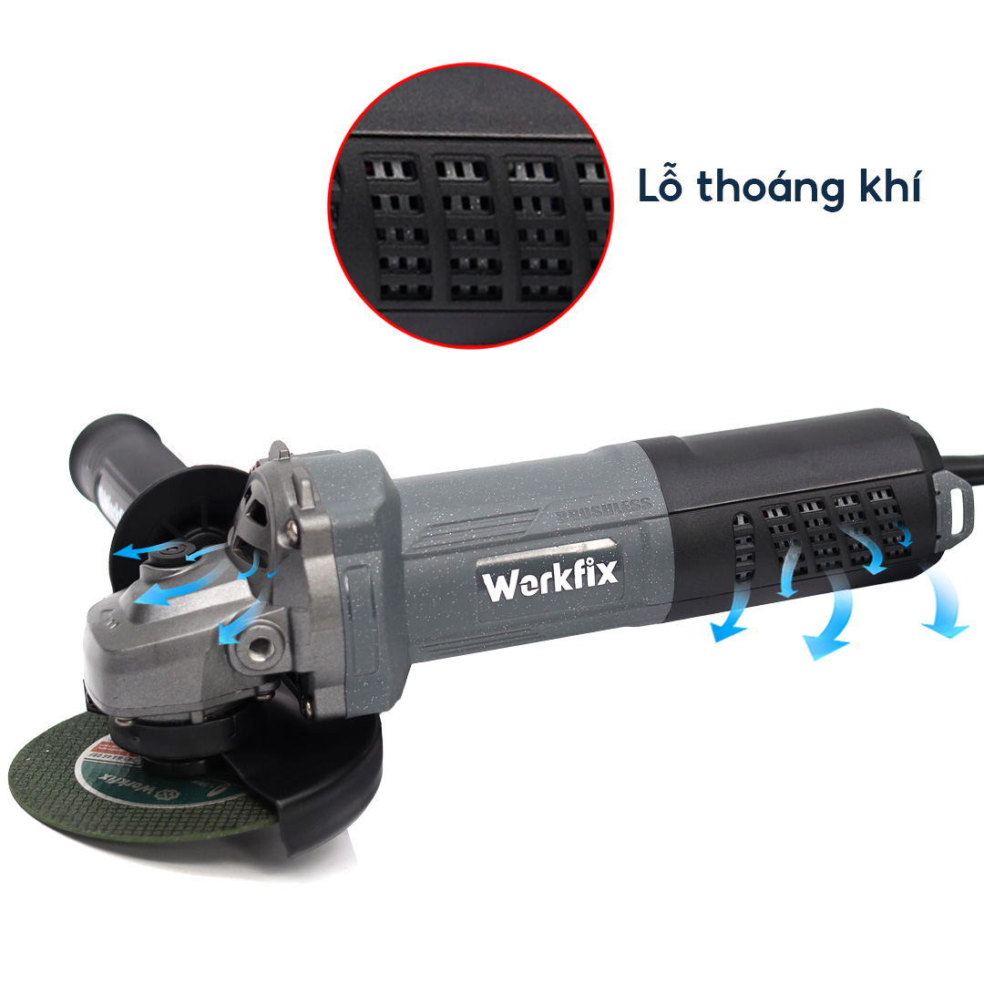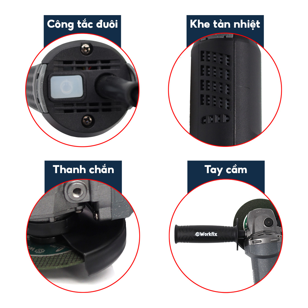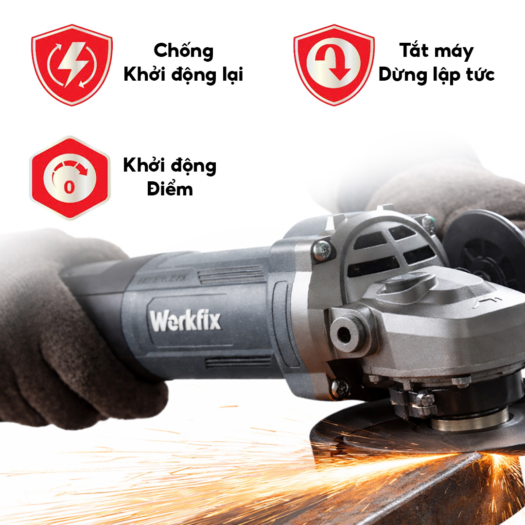 Máy mài Workfix cao cấp trang bị 3 tính năng an toàn: chống khởi động lại, tắt máy dừng ngay lập tức, khởi động mềm.