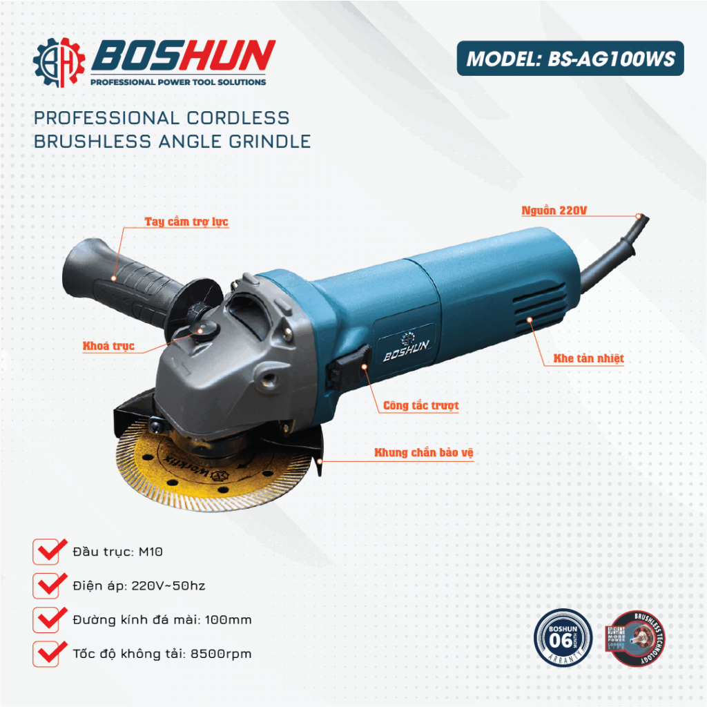 - Máy mài, máy cắt dùng điện Boshun BS-AG100WS chuyên dùng để mài góc, cắt sắt, cưa gỗ, cắt gạch, cắt đá hoa cương trong gia đình hoặc công trình xây dựng