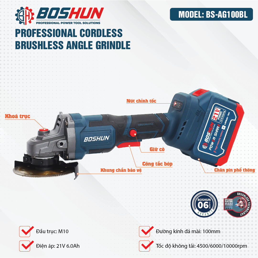 Với công suất 850W, tốc độ không tải 10000 v/p. Máy mài Boshun AG100BL sở hữu đầy đủ 3 chức năng: