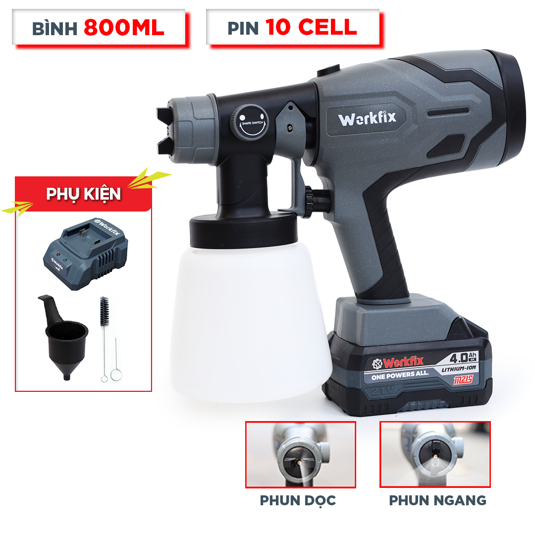 • Tên sản phẩm: Máy phun sơn pin WORKFIX WF-SG800ML, Động cơ Không chổi than 650ml/p, Bình 800ml, 2 kiểu phun
