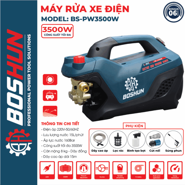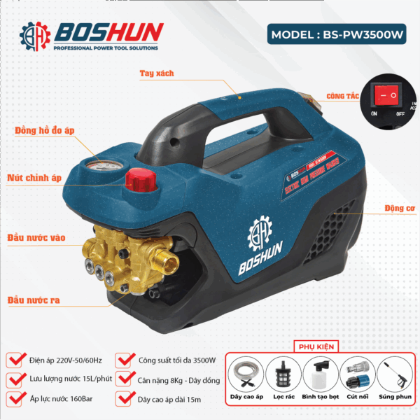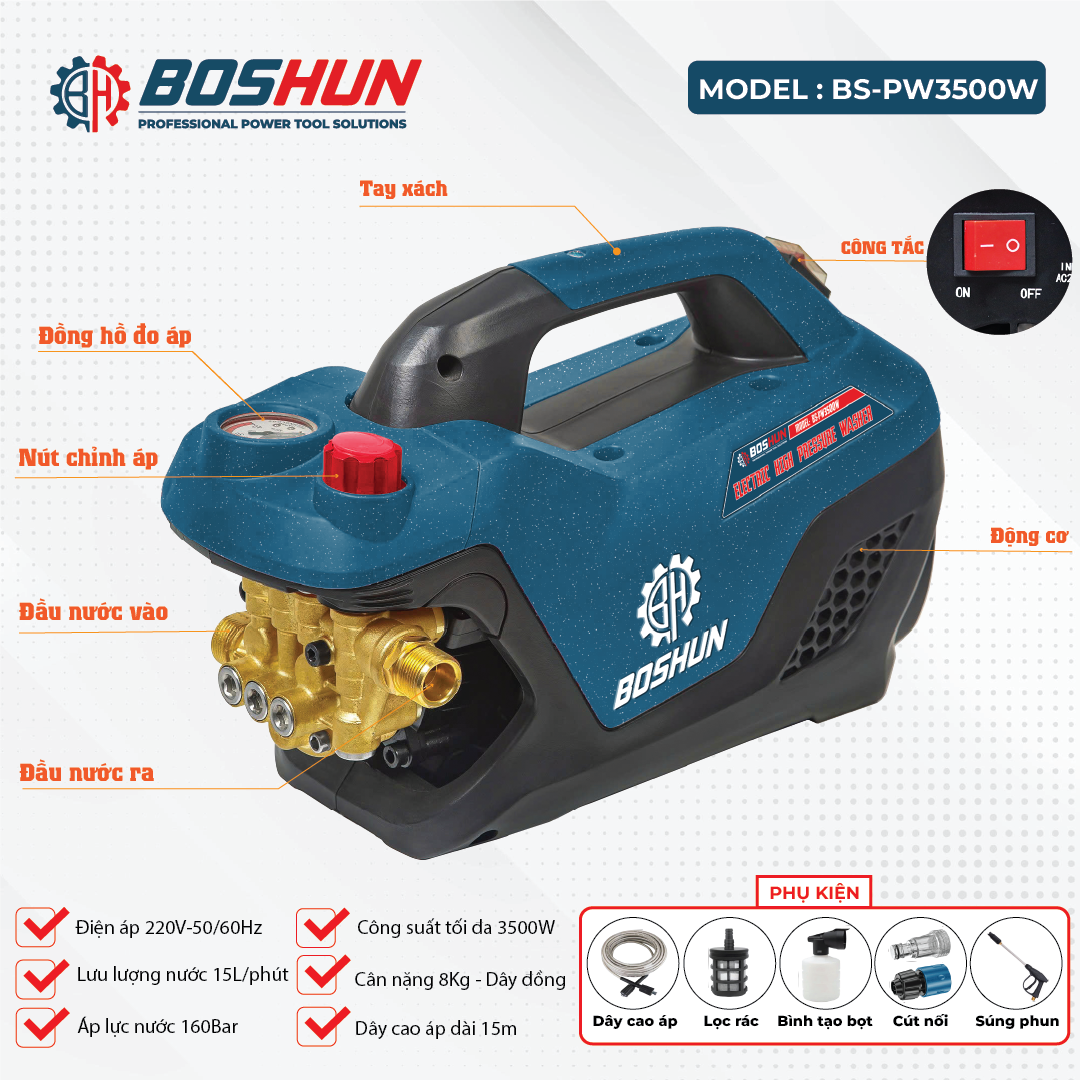 Máy rửa xe Boshun BS-PW3500W – Công Suất 3500W – Máy rửa xe có chỉnh áp – Lõi đồng 100%