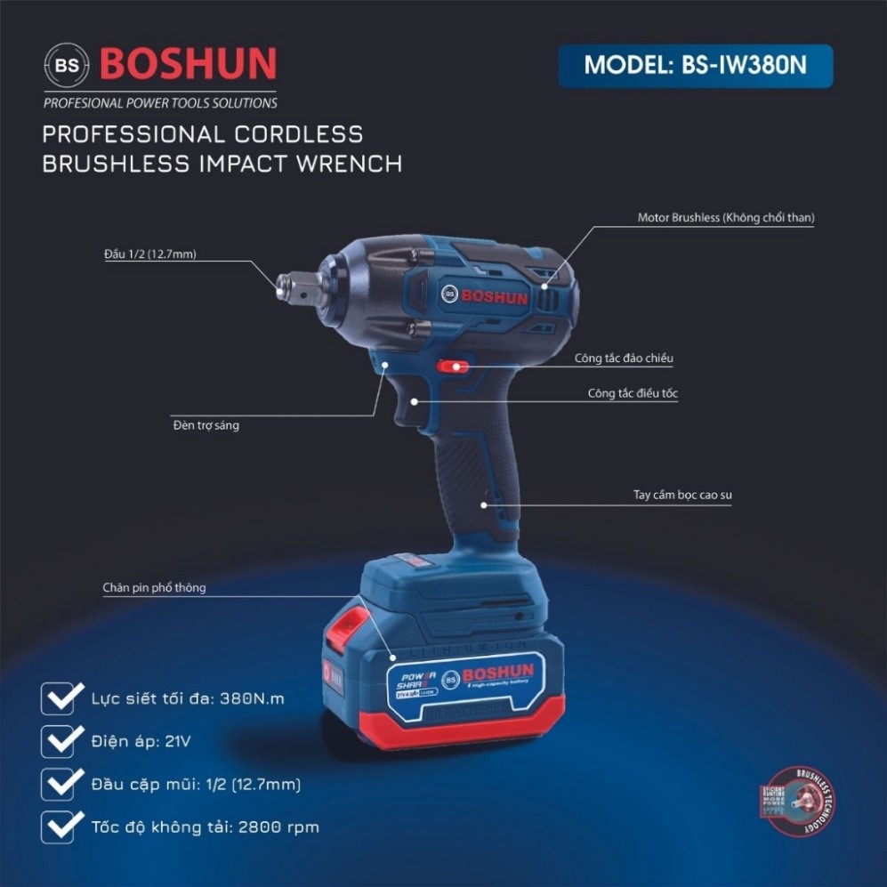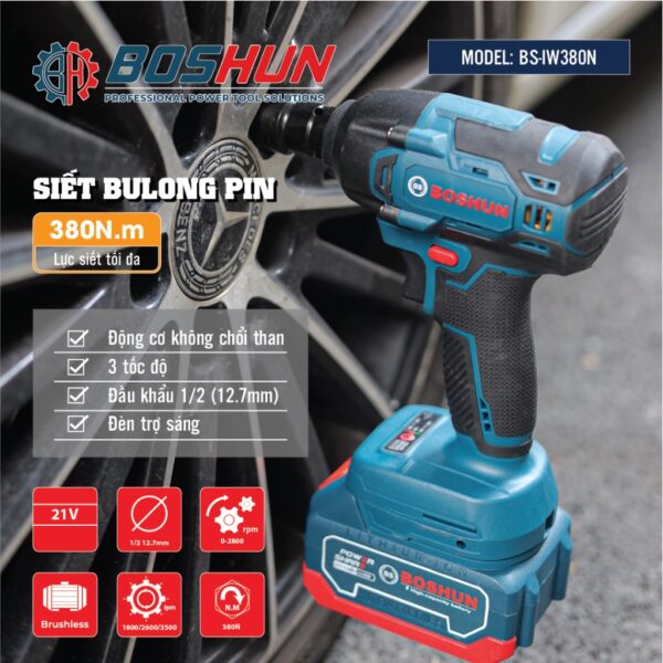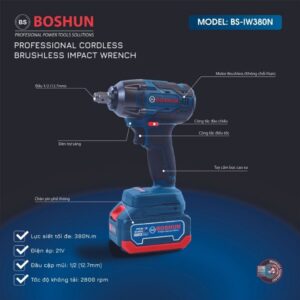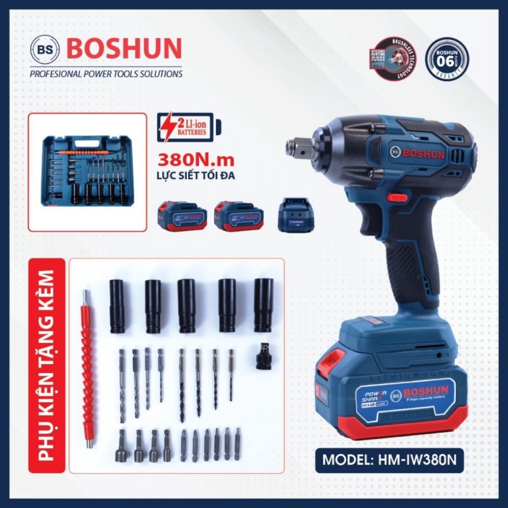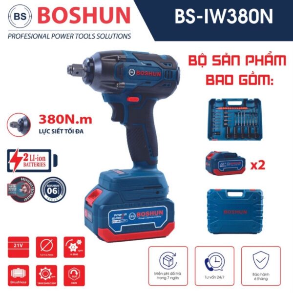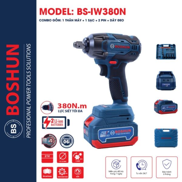 Máy siết bulong BOSHUN BS-IW380N Đầu 2 trong 1 – Lực siết 380NM – Tặng kèm bộ phụ kiện 24 chi tiết