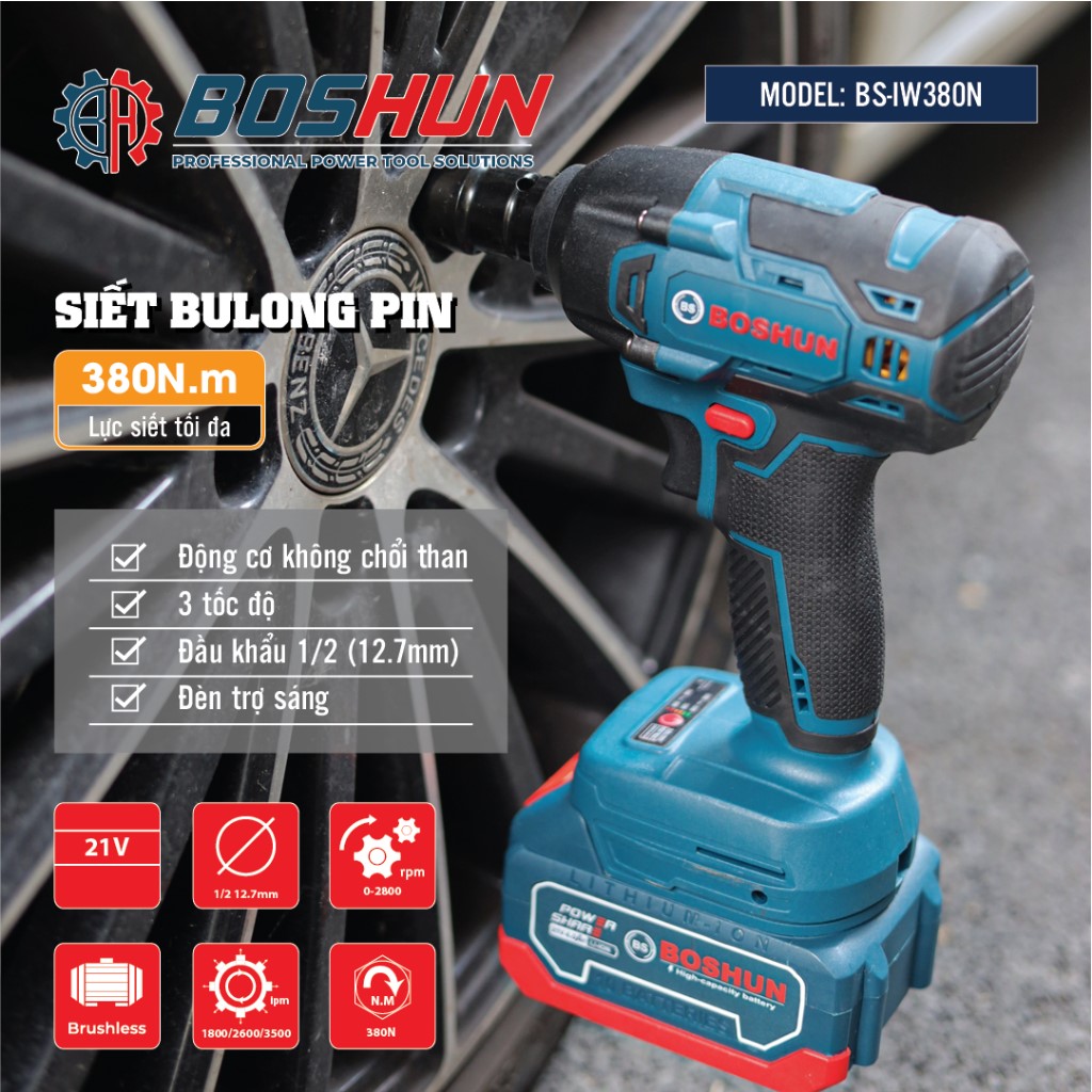 Review Máy siết bulong BOSHUN BS-IW380N Đầu 2 trong 1 – Lực siết 380NM – Tặng kèm bộ phụ kiện 24 chi tiết