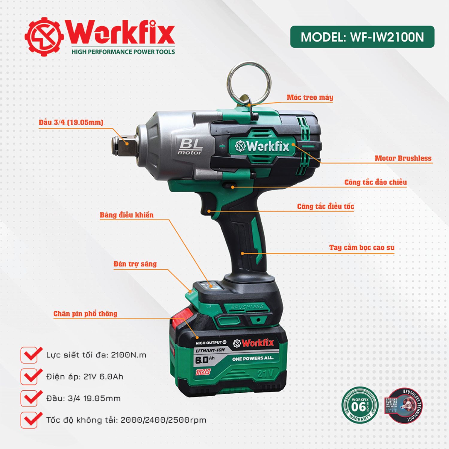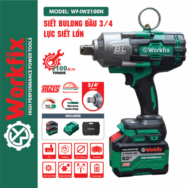 Máy Siết Bulong Workfix WF-IW2100N Chuyên Vặn Mở Vặn Ốc Xe Kéo, Xe Tải