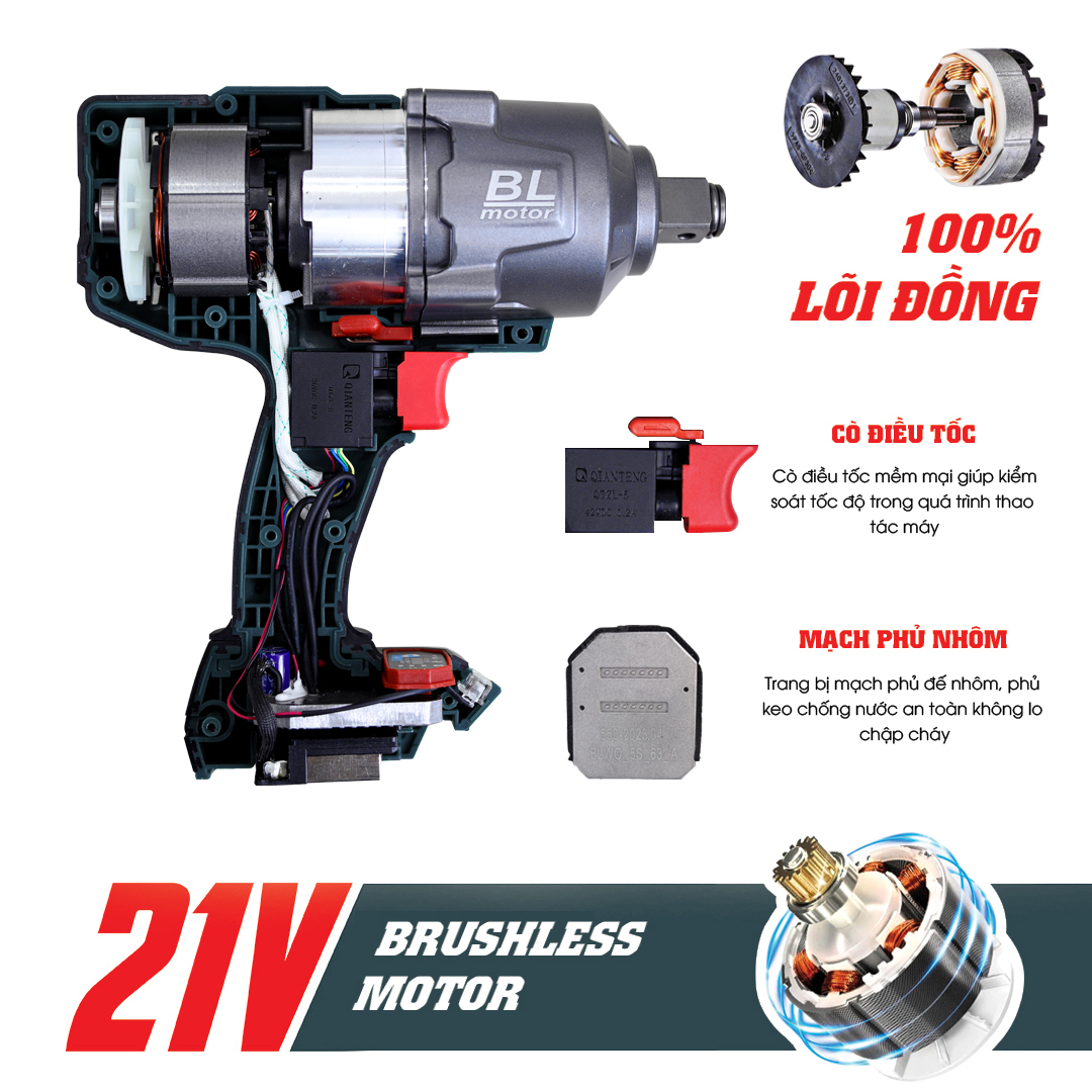 • Động cơ KHÔNG chổi than, motor ruột đồng 100%
