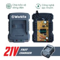 - Máy siết bulong WORKFIX đa năng được trang bị kèm theo 1 sạc nhanh 220V. Công suất sạc nhanh chóng sạc đầy pin chỉ trong 1 giờ. Tích hợp chip thông minh điều áp tự ngắt khi đầy pin đảm bảo an toàn và gia tăng tuổi thọ pin