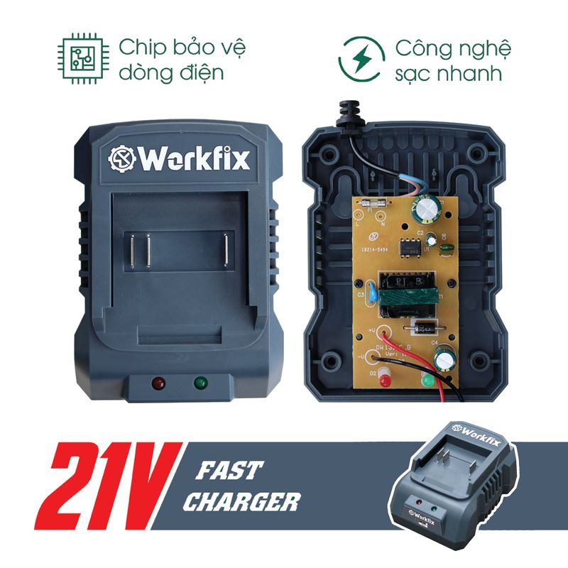 • Máy siết bulong WORKFIX đa năng được trang bị kèm theo 1 sạc nhanh 220V. Công suất sạc nhanh chóng sạc đầy pin chỉ trong 1 giờ. Tích hợp chip thông minh điều áp tự ngắt khi đầy pin đảm bảo an toàn và gia tăng tuổi thọ pin