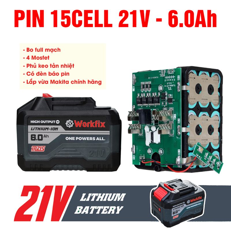 • Pin công nghệ LITHIUM ION 21V – 6.0Ah và mạch bảo vệ pin 4 mosfet cao cấp bảo vệ quá tải, bảo vệ quá mức, bảo vệ ngắn mạch giúp máy làm việc ổn định, an toàn hiệu suất cao đem lại thời gian hoạt động lâu hơn 35% lên đến 4-5h